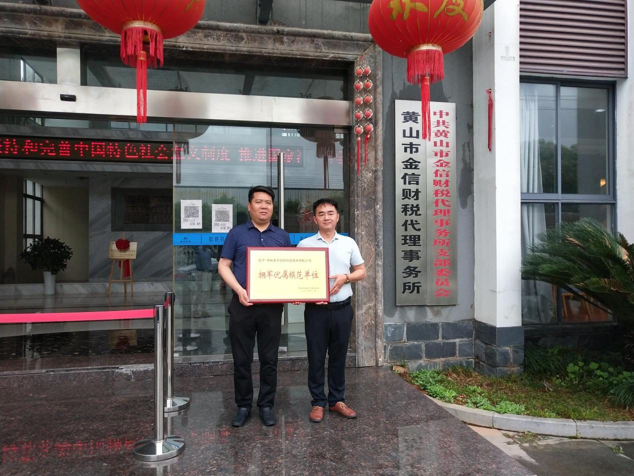2021年5月11日,歙縣退役軍人事務(wù)局洪四如局長(zhǎng)專程來(lái)到我公司,代表黃山市雙擁工作領(lǐng)導(dǎo)組頒發(fā)全市“擁軍優(yōu)屬模范單位”牌匾。公司總經(jīng)理胡海鋒、綜合部經(jīng)理方志義接受牌匾。